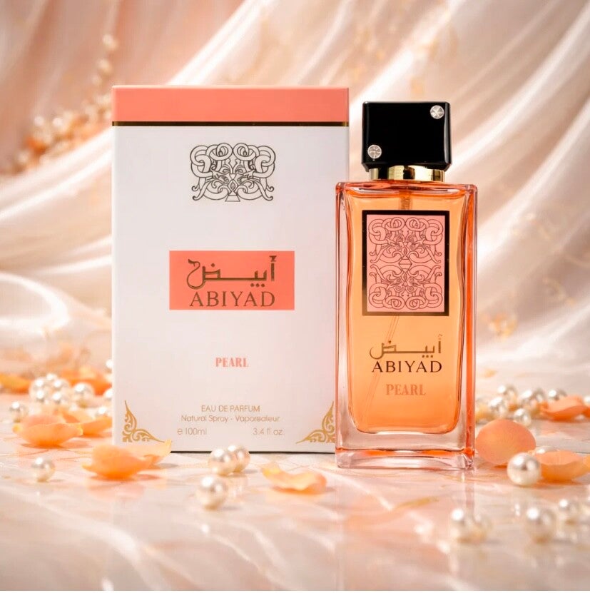 Abiyad Pearl pour femme, Collection Couture Parfum 100 ml, Eau de Parfum en vaporisateur. Notes de tête : Pêche, Pastèque, Orange. Notes de cœur : Noix de coco, Fleurs blanches. Notes de fond : Vanille, Ambre, Musc. Abiyad Pearl pour femme